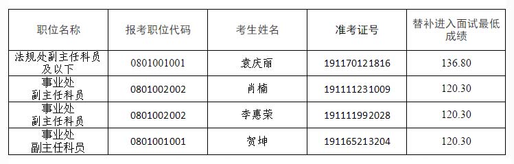 因部分考生自愿放棄面試資格,根據(jù)公務(wù)員招考有關(guān)規(guī)定,經(jīng)主管部門批準(zhǔn),現(xiàn)按照招考職位未進(jìn)入面試考生綜合科目筆試成績(jī)由高到低的順序,遞補(bǔ)以下考生為面試人選(同職位考生按準(zhǔn)考證號(hào)排序):