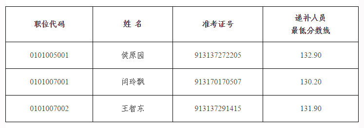因部分進入面試考生自愿放棄面試資格,根據中央組織部、人力資源和社會保障部、國家公務員局關于公務員考試錄用工作的有關規(guī)定,在報考該職位公共科目筆試成績合格的考生中,按照成績由高到低的順序進行遞補。遞補人選如下:
