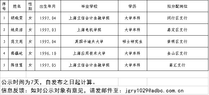 2019年中國農(nóng)業(yè)發(fā)展銀行上海分行校園招聘擬補(bǔ)錄人員名單