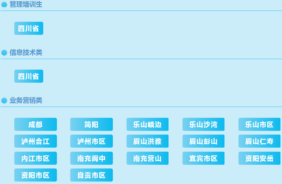 成都,樂山市區(qū)及峨邊、沙灣,宜賓市區(qū),內(nèi)江市區(qū),自貢市區(qū),資陽市區(qū)及安岳,簡陽,瀘州市區(qū)及合江,南充閬中及營山,眉山洪雅、仁壽及彭山。 應(yīng)聘人員需服從本行對工作地點(diǎn)的調(diào)配,全日制本科生工作地點(diǎn)為縣級支行;重點(diǎn)院校本科及以上學(xué)歷工作地點(diǎn)為各分行;管理培訓(xùn)生,作為總行和分行員工儲備生,結(jié)束統(tǒng)一培訓(xùn)期并考察合格后優(yōu)先選派到總行和分行相關(guān)部門工作。